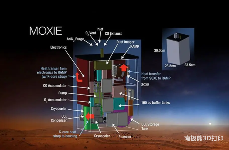 "毅力號 "火星車的其他6個3D打印部件在 "火星氧氣原位資源利用實驗 "儀器中,簡稱MOXIE。這個設備將測試新的技術,未來可以生產工業數量的氧氣,在火星上制造火箭推進劑,幫助宇航員發射回地球。