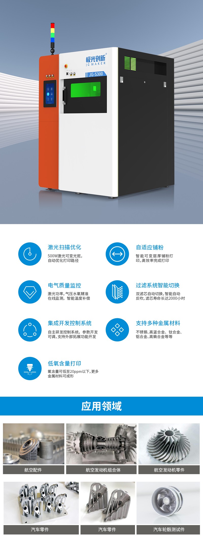 同時(shí),作為3D打印行業(yè)的頭部企業(yè),極光創(chuàng)新一直緊跟市場(chǎng)步伐,積極研發(fā)出更適合市場(chǎng)需求的3D打印產(chǎn)品,日前推出的全新工業(yè)級(jí)金屬3D打印設(shè)備JG-S300,可以全方位滿足工業(yè)市場(chǎng)各領(lǐng)域用戶的需求,助力企業(yè)加快市場(chǎng)研發(fā)效率、降本增效的同時(shí),不斷提升市場(chǎng)的占有率。