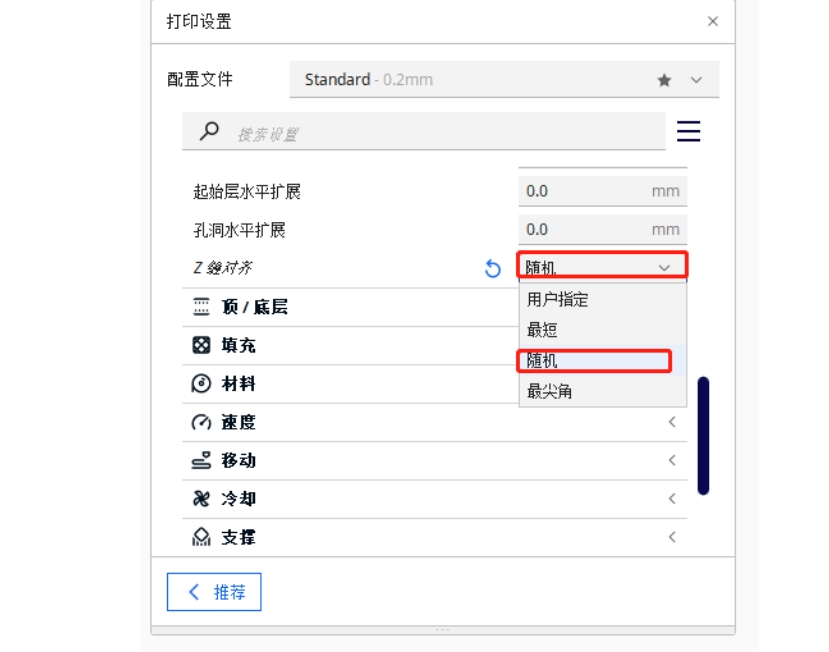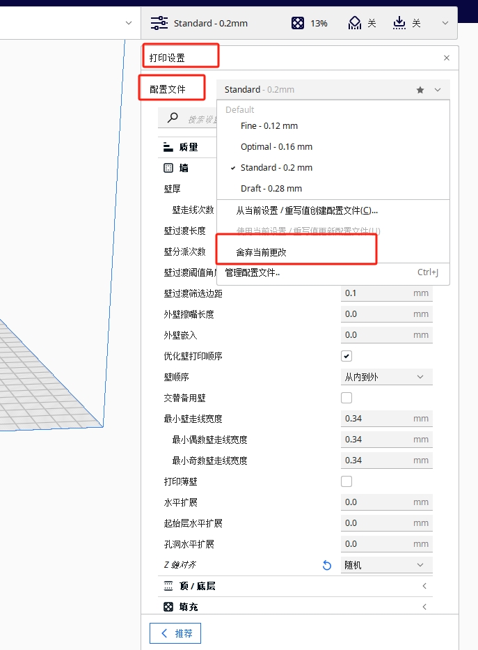 2.點(diǎn)擊“基本”,選擇“語(yǔ)言”,然后再點(diǎn)擊“簡(jiǎn)體中文”,軟件頁(yè)面就成功切換成簡(jiǎn)體中文了。 二、接縫問(wèn)題 最近各種3D打印的刀、劍、棒模型火遍各大視頻平臺(tái),很多小伙伴摩拳擦掌,躍躍欲試,可是也有些伙伴在模型打印完成后,遇到打印出來(lái)的模型甩不出來(lái)的問(wèn)題。 小創(chuàng)在這里可以提供兩個(gè)解決的辦法: 1.是將模型擴(kuò)大,增加每層接縫之間的縫隙; 2.是調(diào)整Z軸距離,具體操作請(qǐng)看下圖。 在軟件右邊菜單欄選擇“墻”這個(gè)選項(xiàng),然后點(diǎn)擊“Z縫對(duì)齊”,最后選擇“隨機(jī)”就可以了。 三、如何恢復(fù)到默認(rèn)參數(shù)設(shè)置 還有一些愛(ài)探索的玩家,在打印不同的模型的時(shí)候喜歡自己去進(jìn)行參數(shù)設(shè)置,時(shí)間長(zhǎng)了之后導(dǎo)致參數(shù)設(shè)置混亂,后面的模型打印不成功,然后又不知道該怎樣恢復(fù)到默認(rèn)參數(shù)設(shè)置!別急,小創(chuàng)來(lái)幫您。 很簡(jiǎn)單,您只需在軟件右邊“打印設(shè)置”-“配置文件”中點(diǎn)擊“舍棄當(dāng)前更改”就可以恢復(fù)到默認(rèn)設(shè)置。 以上就是近期后臺(tái)小伙伴遇到的較多的問(wèn)題,如果您還有其他問(wèn)題需要解決,隨時(shí)可以在后臺(tái)私聊小創(chuàng),或者直接咨詢(xún)我們的售后客服哦!